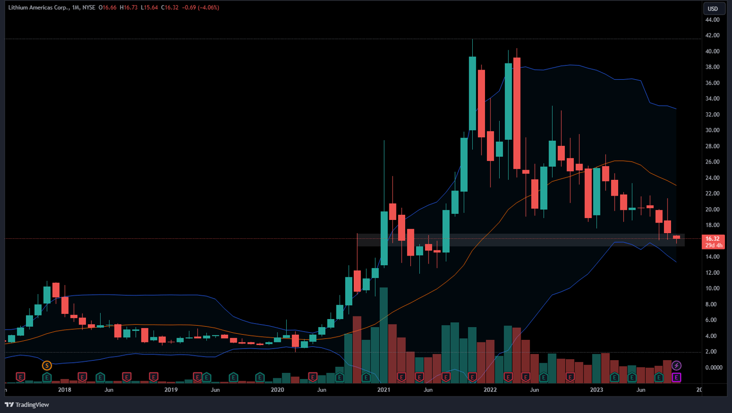 LAC's stock is currently in a zone of support on the monthly chart at $16.19. This zone often serves as a reliable entry point for long positions, especially when aligned with other technical indicators. Additionally, the stock is $3 higher than the lower Bollinger Band on the monthly chart. While these indicators may suggest a potential upside, it may be prudent for investors to wait for a higher low on the daily chart before considering a long position.